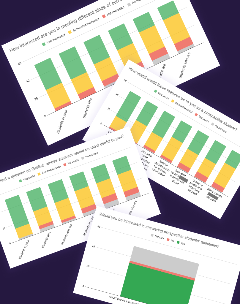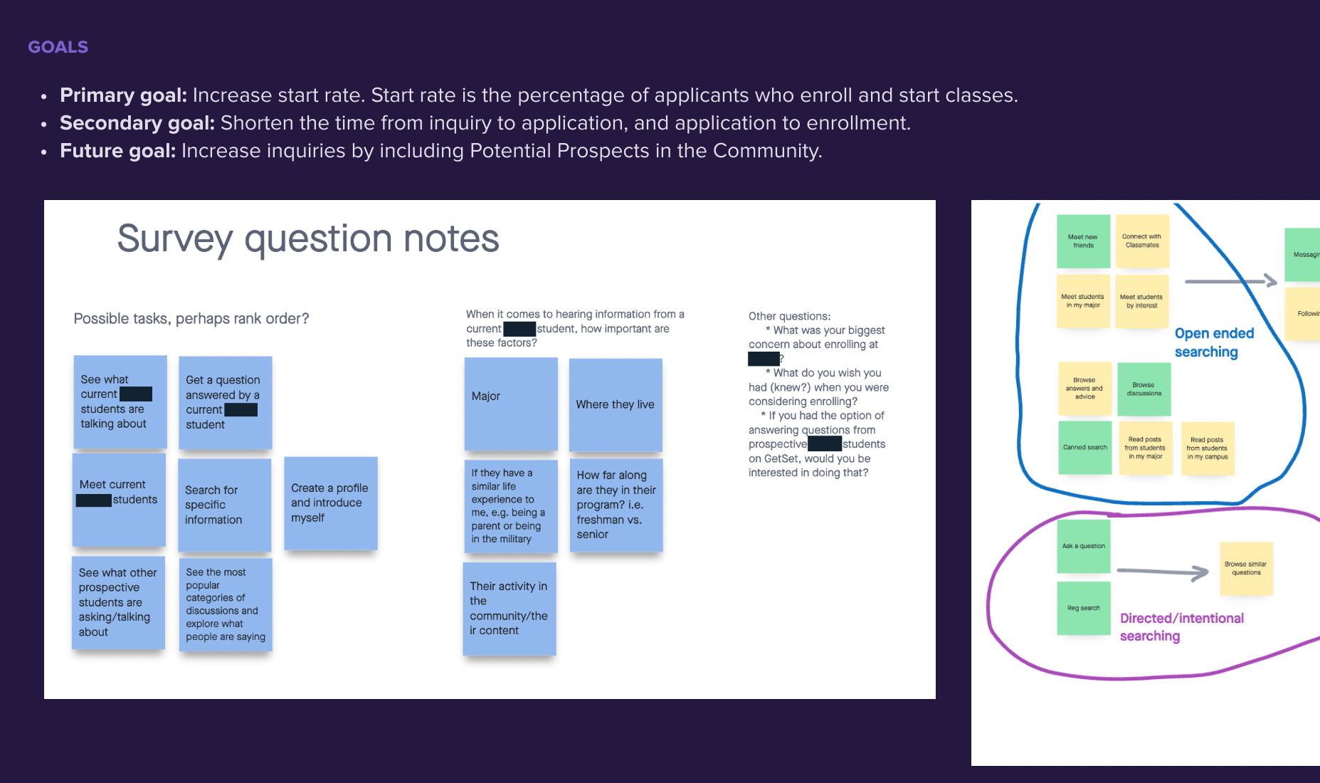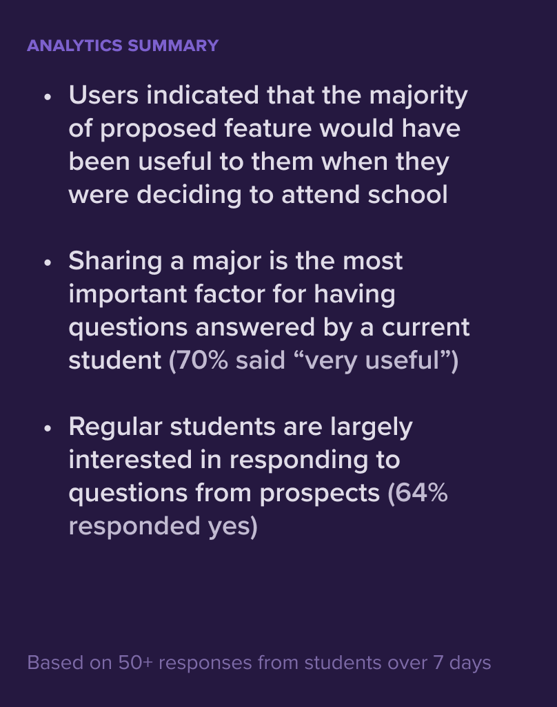 After the internal audit, the next step was user research. We sent out a survery designed to get feedback from currently enrolled students--what they would’ve liked to see as a prospect, what kinds of information would’ve been most helpful, and if they’d be willing to help prospective students on the platform in the future.